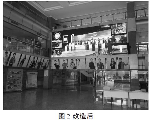 我臺原大堂中廳內的LED顯示屏幕采用紅綠單色顯示屏幕,寬4米,高2.88米,主要作用是播放局臺各類重要信息通知,播放只能通過文字形式,只能滿足日常管理方面的需求。經過內部技術委員會的多次論證,改造后的屏幕面積必須增加,分辨率必須達到高清分辨率以上。經過設計新裝屏幕,寬7.87米,高2.88米,完全填充中廳內的兩個大柱子。屏幕采用3mm表貼三合一黑燈黑面罩屏幕,燈芯采用臺灣晶元光電Epista) ,分辨率2624x 960顯示,圖像比例為16:6, 像素分辨率很過2K,已經達到高清顯示要求。(圖2)