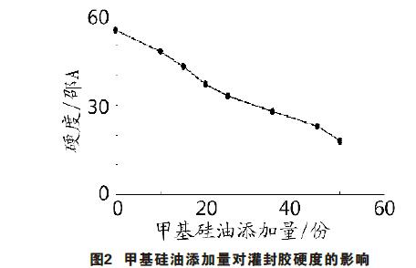 在其他組分不變的前提下,考查了甲基硅油添加量對灌封膠硬度和膠料混合后黏度的影響,結(jié)果見圖2、圖3。